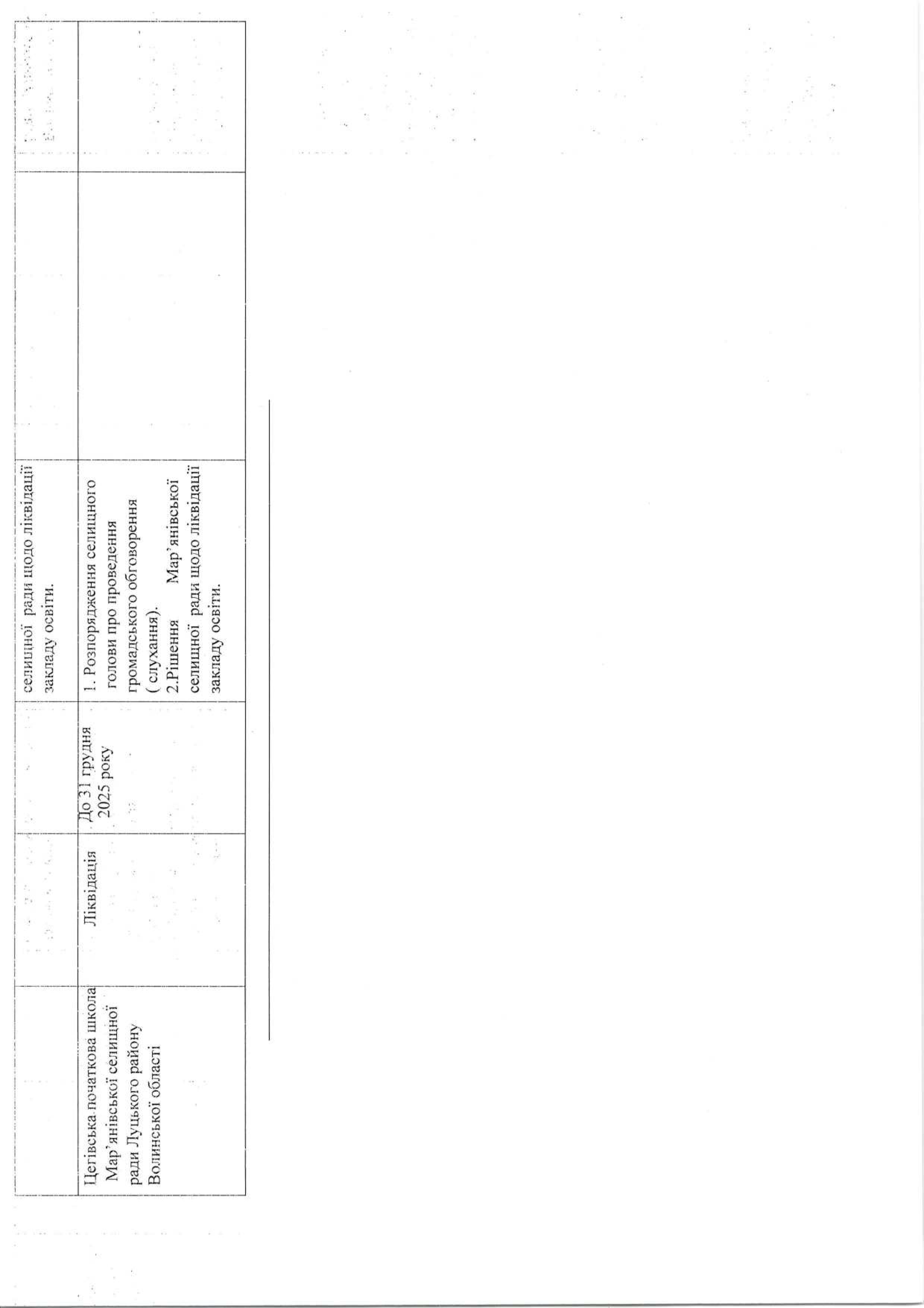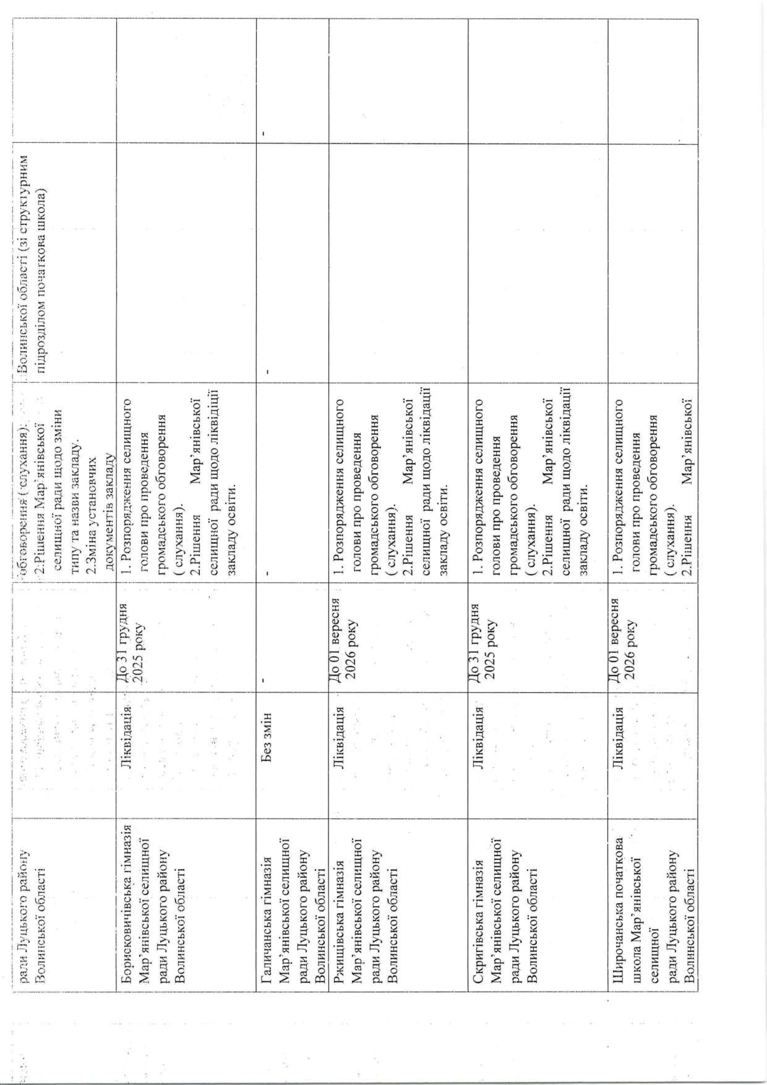 - Перепрофілювати (змінити тип) та перейменувати Мар’янівський ліцей Мар’янівської селищної ради Луцького району Волинської області (45744, Волинська область, Луцький район, селище Мар’янівка, вул. Соборна, 3, код ЄДРПОУ (23020040) на Мар’янівський академічний ліцей Мар’янівської селищної ради Луцького району Волинської області.