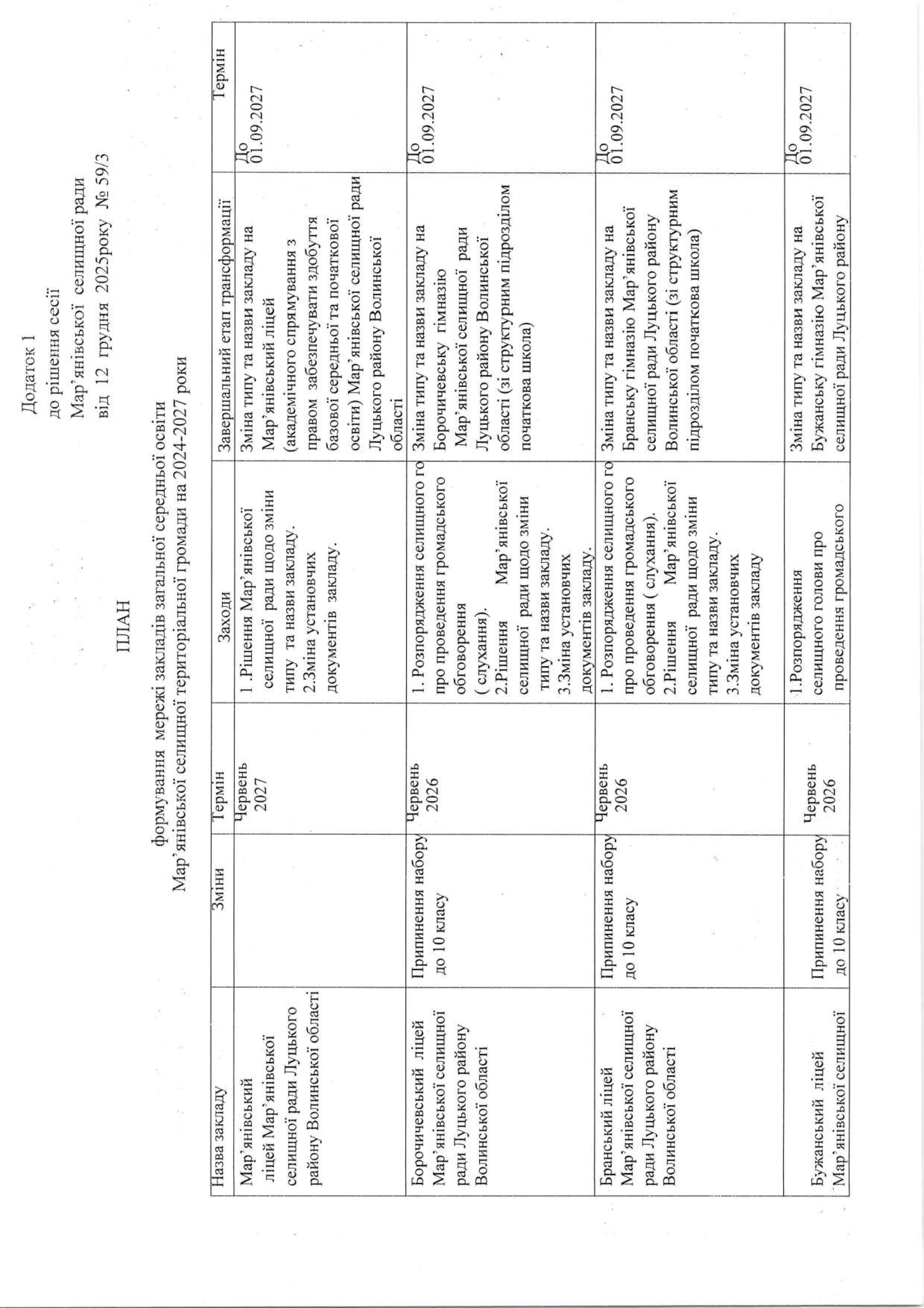 Мар’янівською селищною радою прийняті рішення №44/8 від 14 листопада 2024 року «Про затвердження Плану формування мережі закладів загальної середньої освіти Мар’янівської селищної територіальної громади на 2024-2027 роки» та №59/3 від 12 грудня 2025 року «Про внесення змін до рішення Мар’янівської селищної ради від 14 листопада 2024 року №44/8 «Про затвердження Плану формування мережі закладів загальної середньої освіти Мар’янівської селищної територіальної громади на 2024-2027 роки», відповідно до яких на базі Мар’янівського ліцею планується створити академічний ліцей, а Борочичевський, Бранський і Бужанський ліцеї будуть перепрофільовані у гімназії.