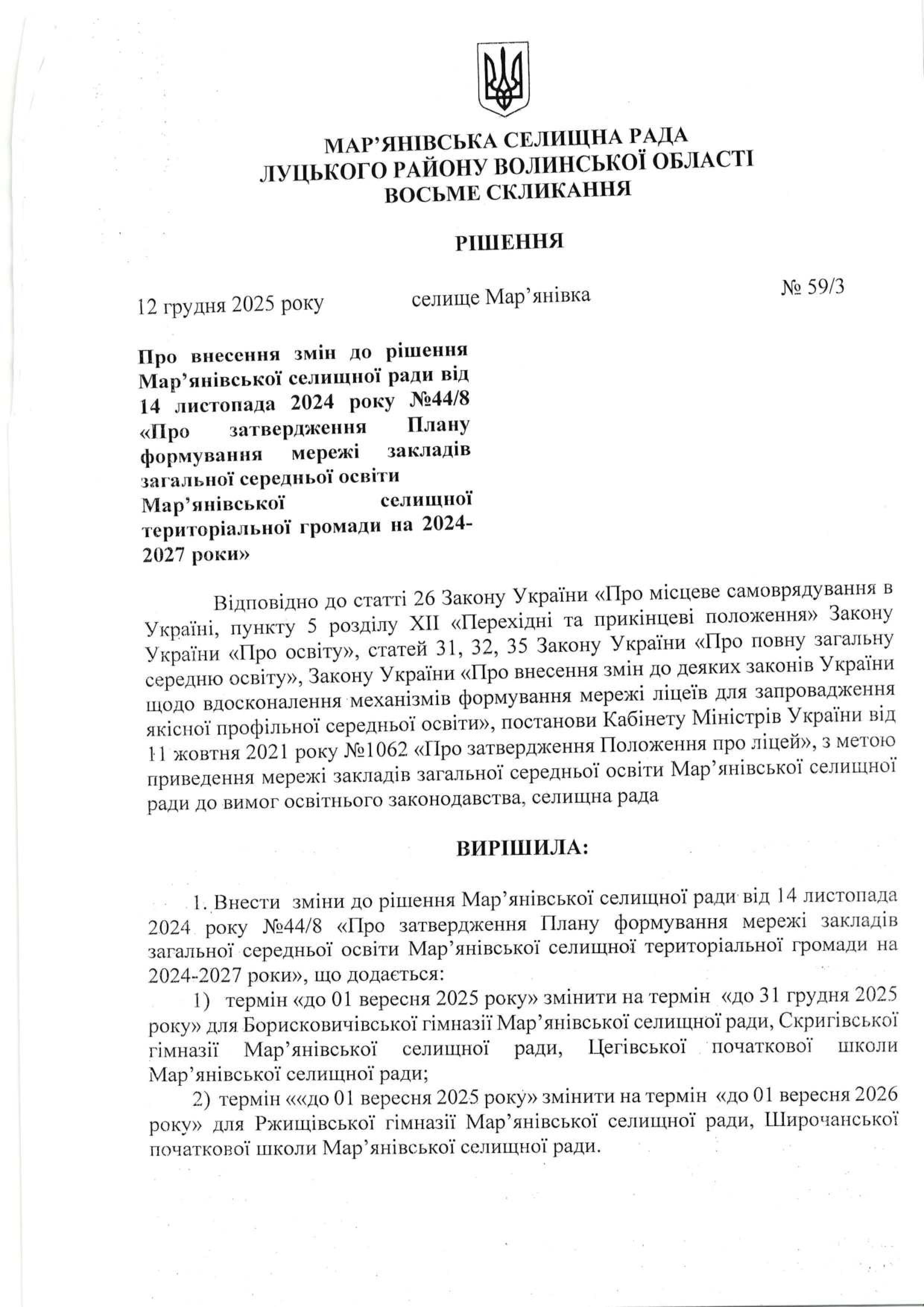 - Директору Мар’янівського академічного ліцею Мар’янівської селищної ради Луцького району Волинської області здійснити заходи, щодо державної реєстрації змін до установчого документу закладу освіти у встановленому законодавством порядку.