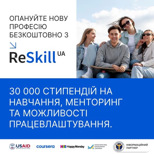 Проєкт ReSkill UA реалізується Coursera та Happy Monday за підтримки Програма USAID «Конкурентоспроможна економіка України» та сприяння Міністерство економіки України.