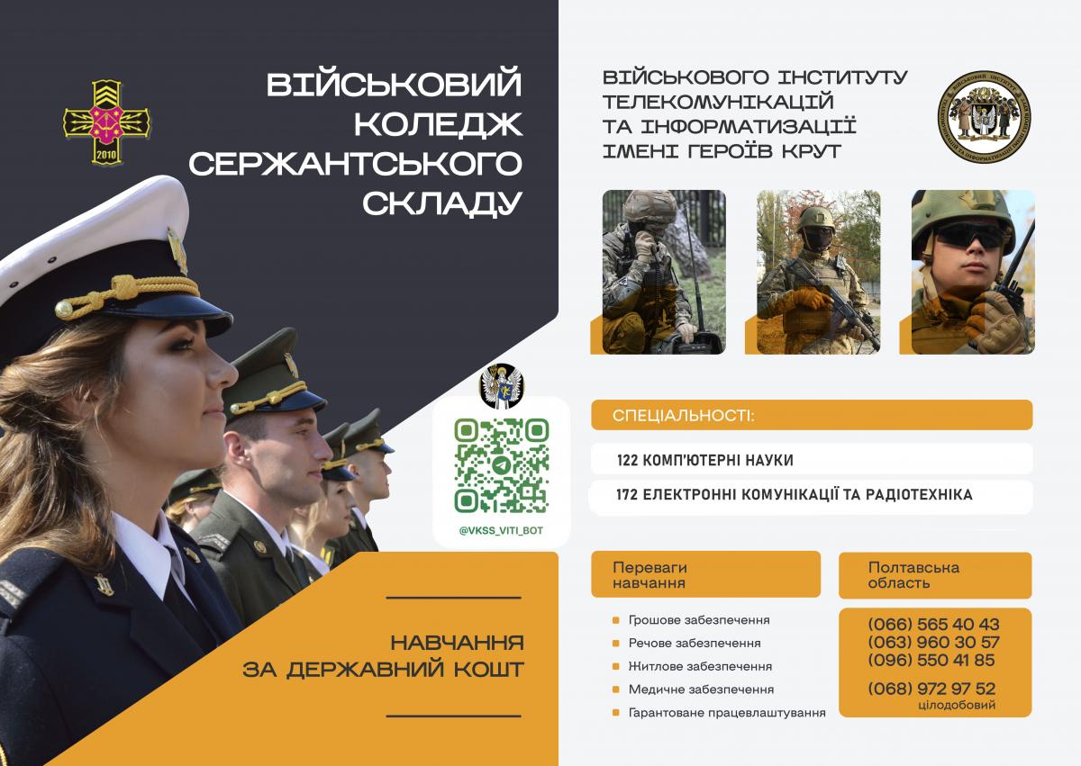 олтавський Військовий коледж сержантського складу Військового інституту телекомунікацій та інформатизації імені Героїв Крут здійснює підготовку фахівців за освітньо-професійним ступенем «фаховий молодший бакалавр» для проходження військової служби за контрактом на посадах сержантського та старшинського складу у Збройних Силах України.