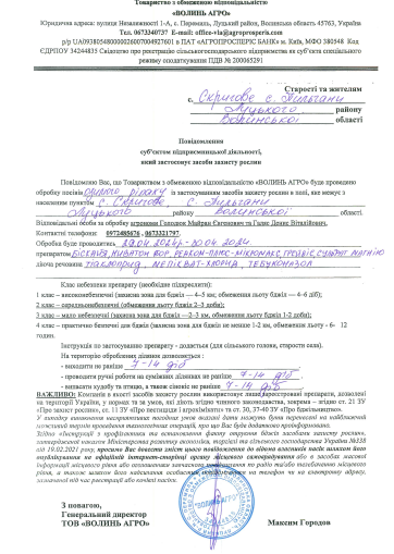 Повідомлення ТОВ «ВОЛИНЬ АГРО» про внесення ЗЗР на посіви озимого ріпаку.