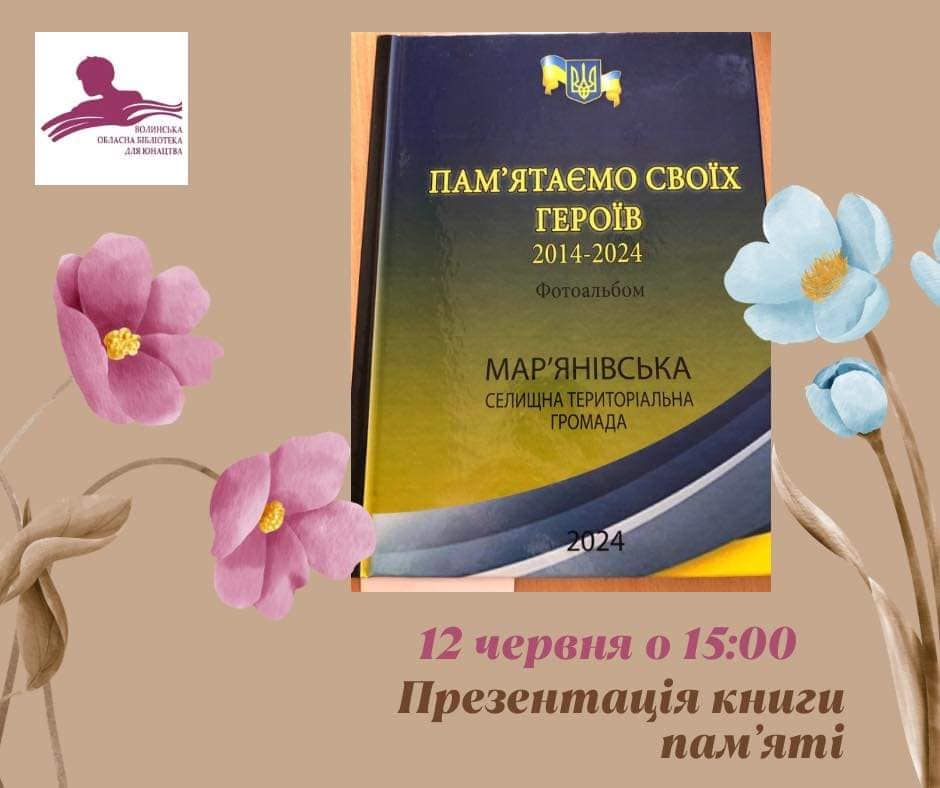 12 червня 2024 року у Волинській обласній бібліотеці для юнацтва відбувалась презентація фотоальбому «Памʼятаємо своїх героїв. 2014-2024» в якій зібрані світлини, біографії, публікації про історії життя захисників Марʼянівської територіальної громади, що захищали нас, відстоювали вільну Україну.