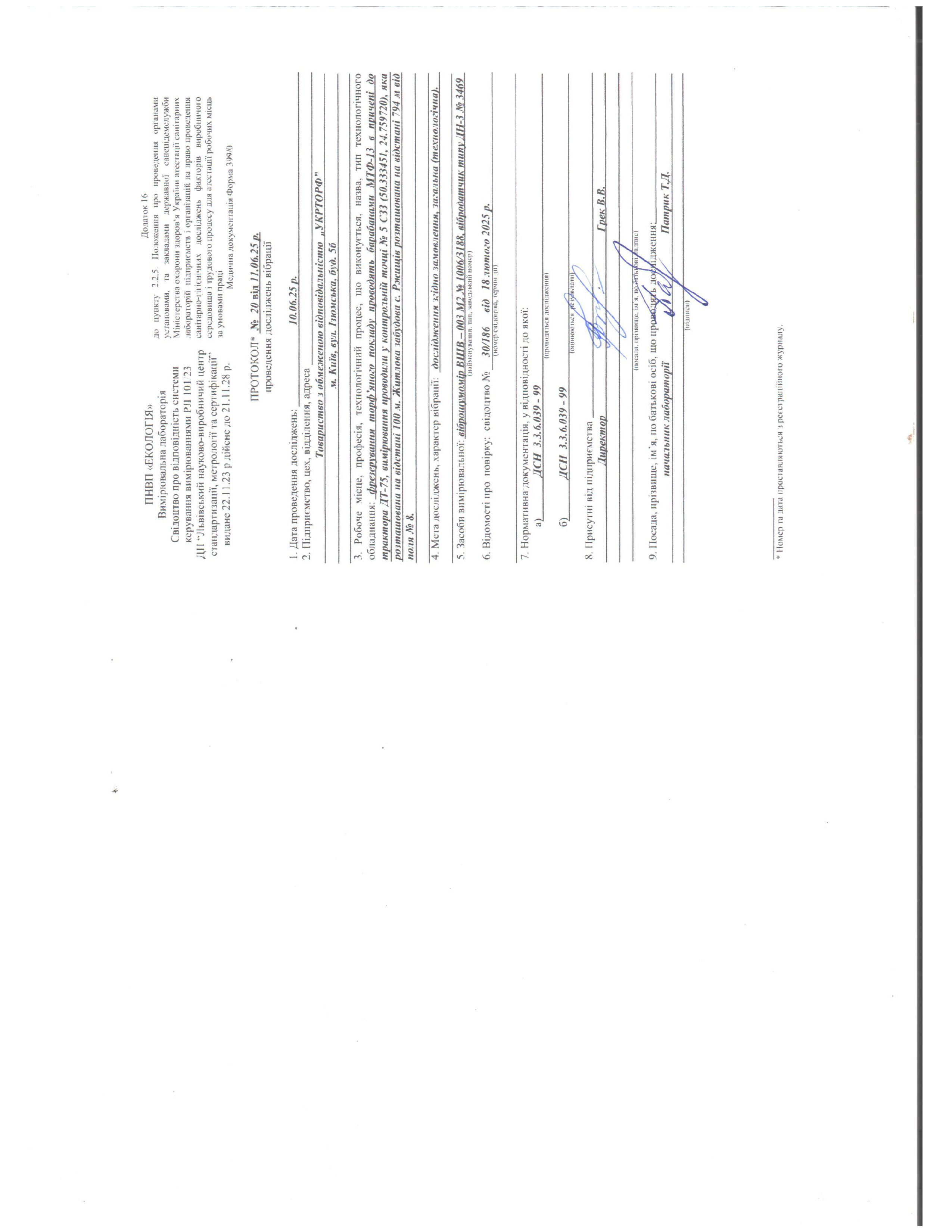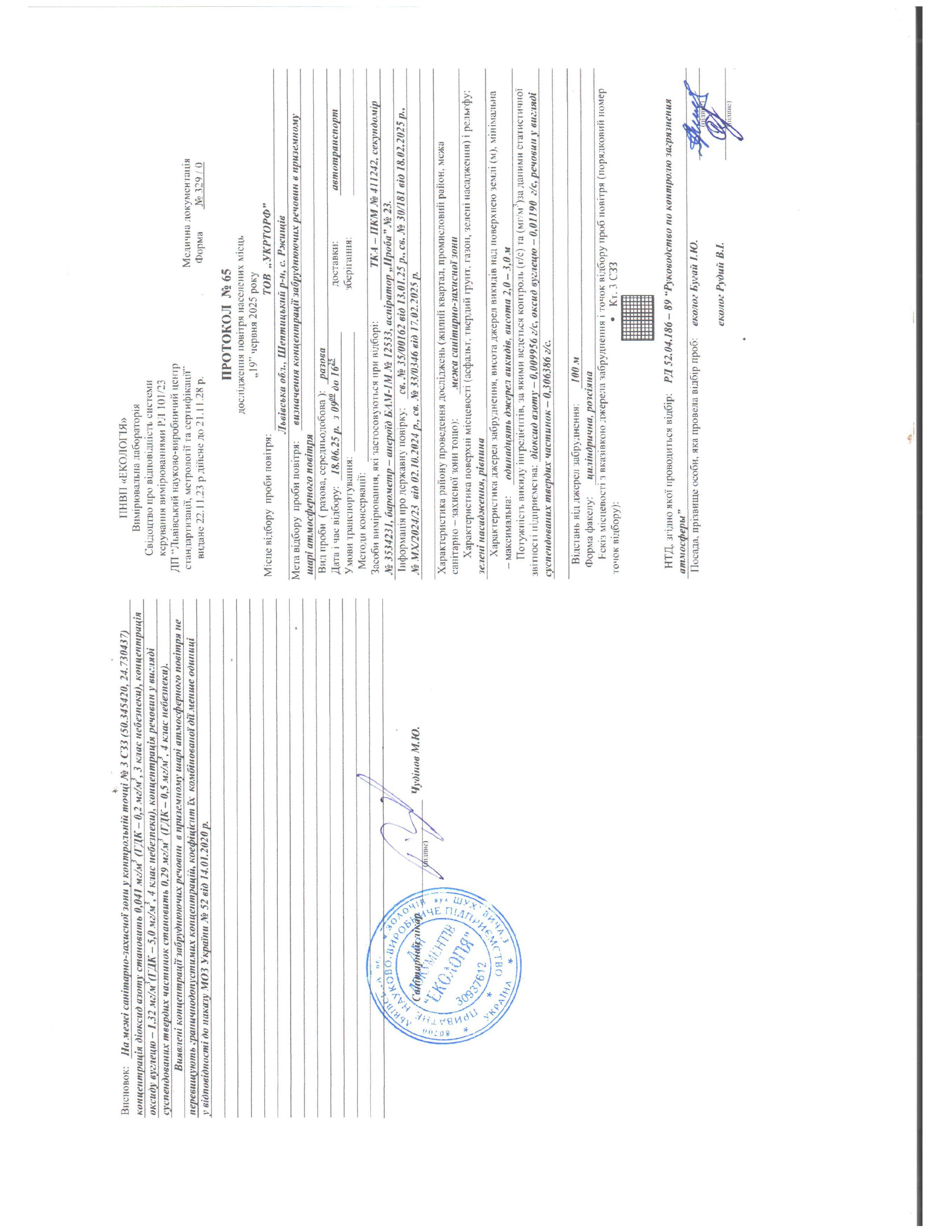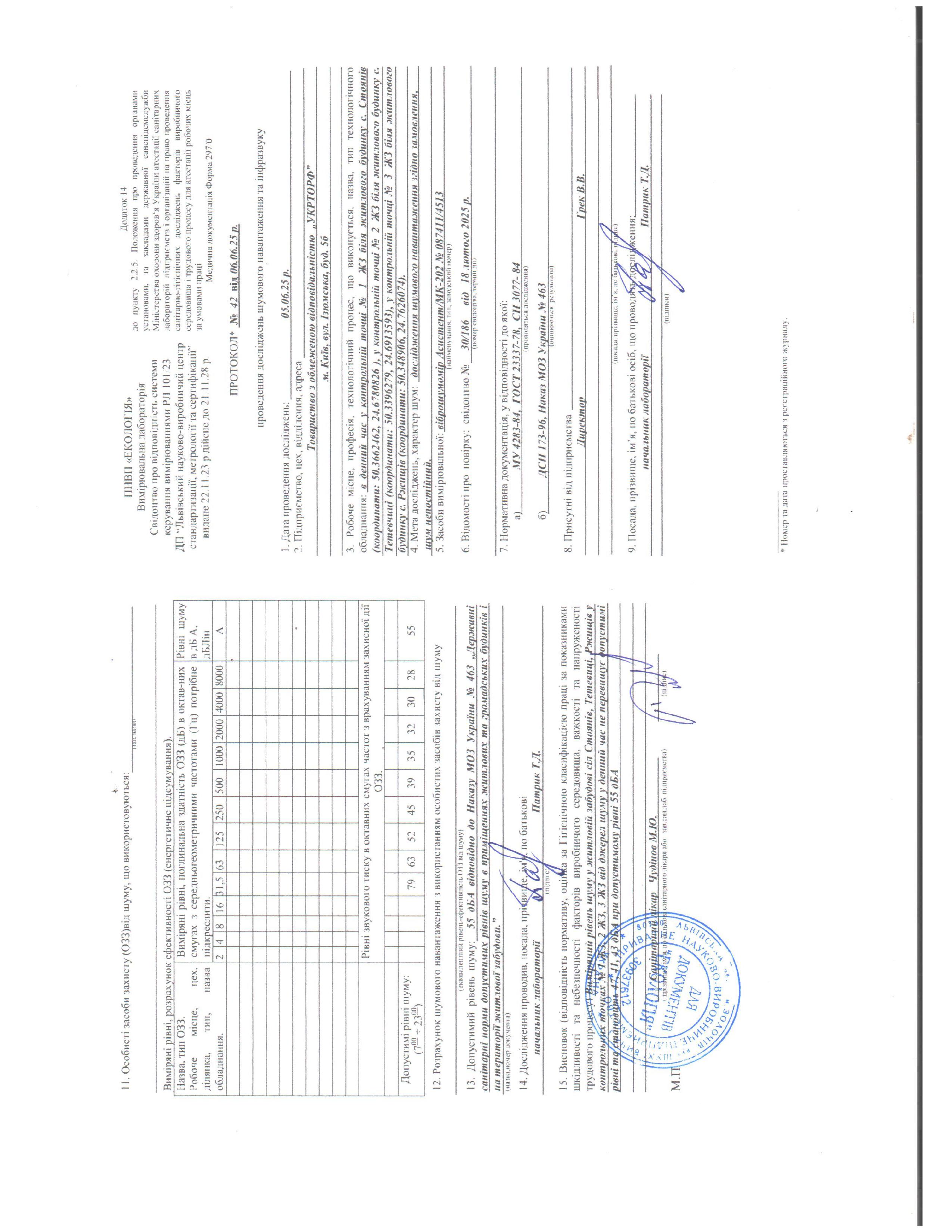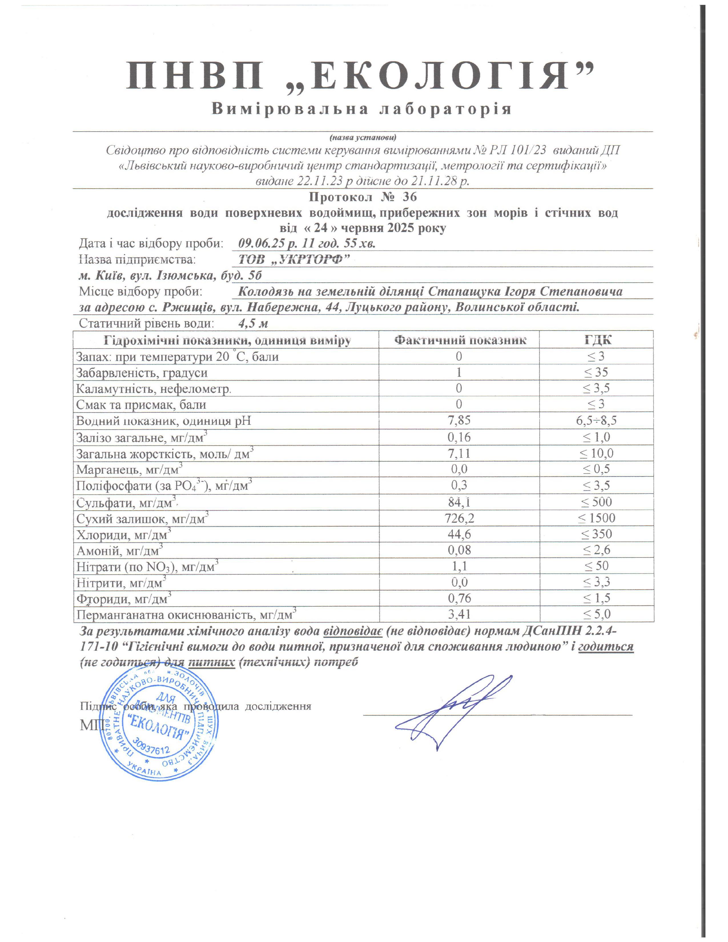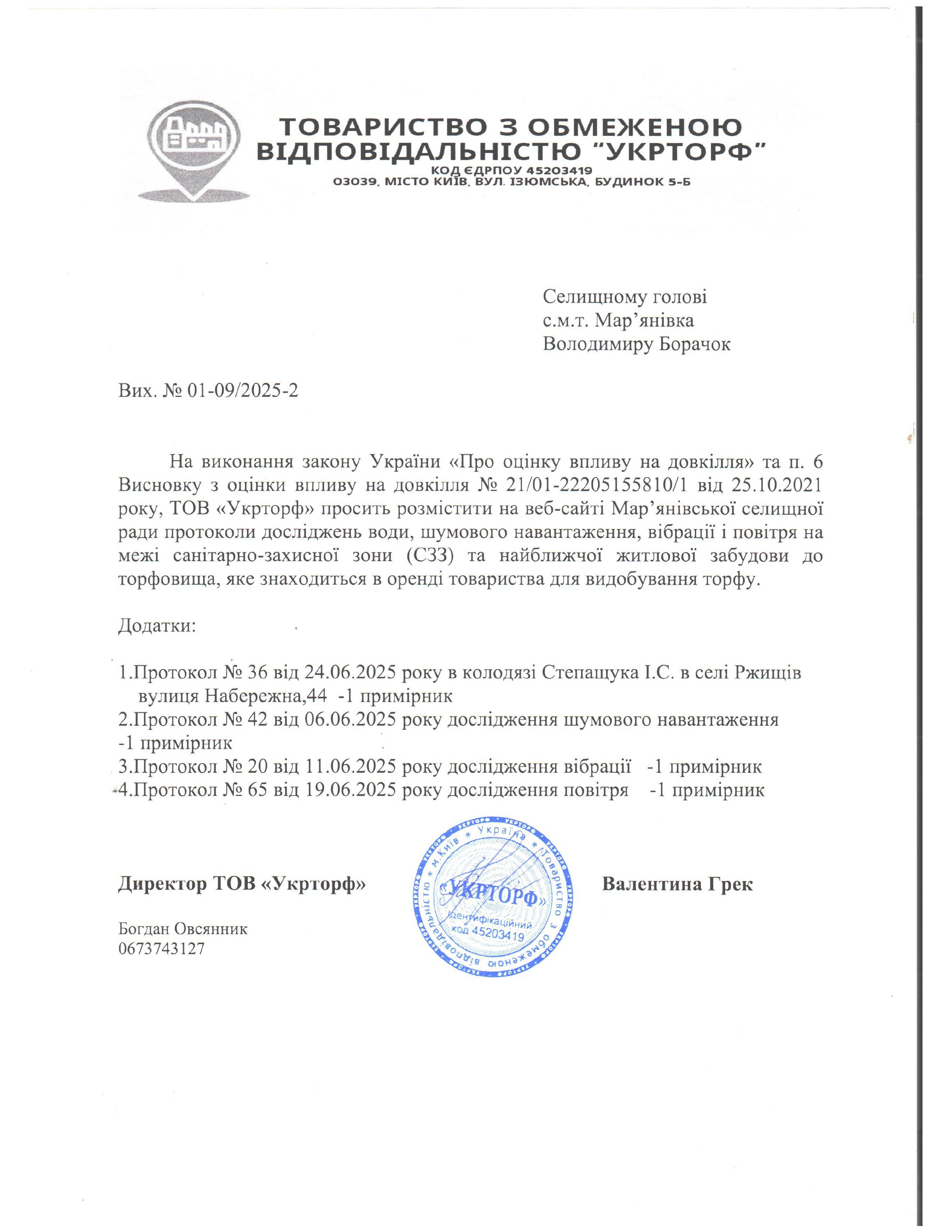 ТОВ "Укрторф". Протоколи досліджень води, шумового навантаження, вібрації і повіря на межі санітарно-захисної зони (СЗЗ) та наближчої житлової забудови до торфовища, яке знаходиться в оренді товариства для видобування торфу.