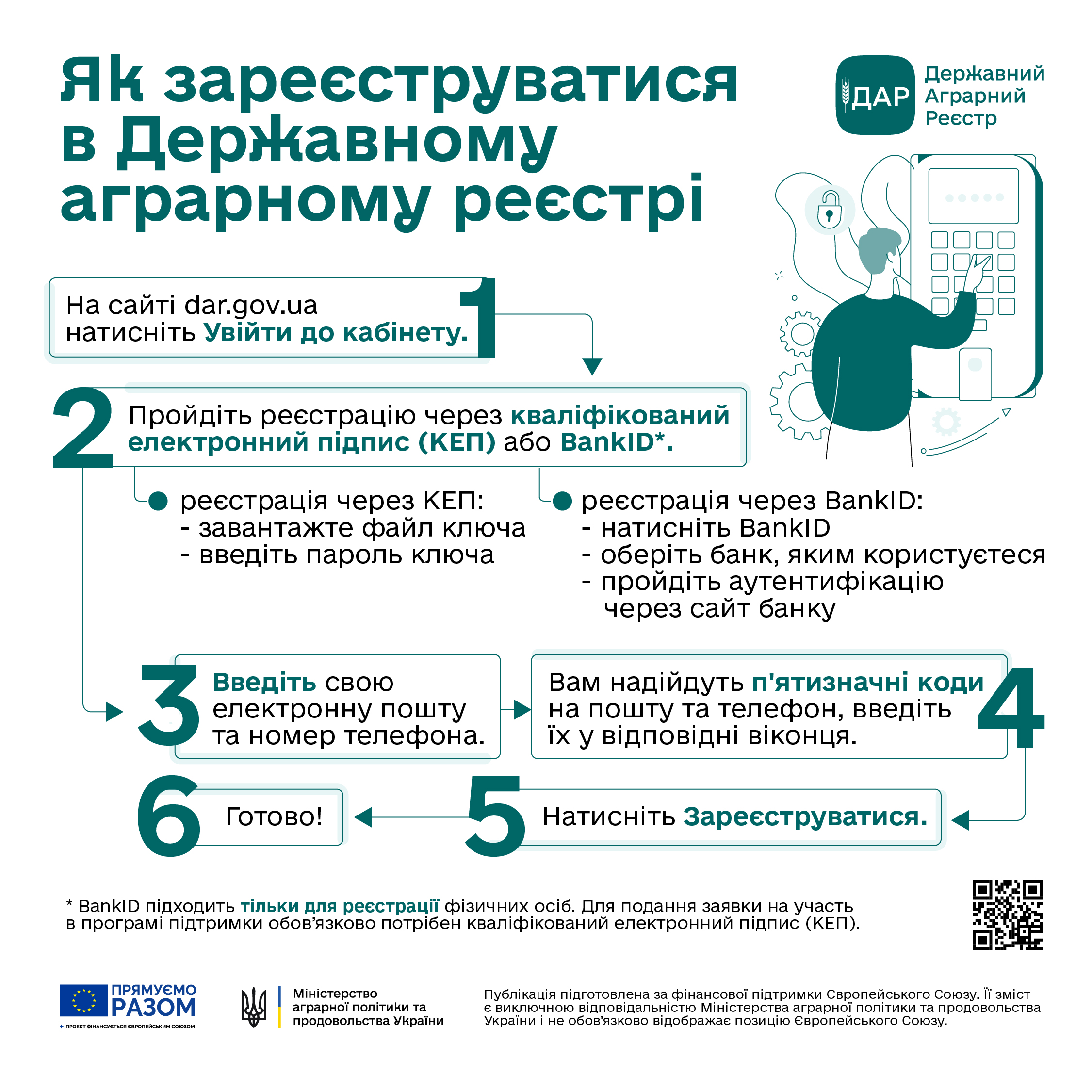 Однією з умов отримання бюджетних коштів – реєстрація отримувача дотації у Державному аграрному реєстрі (далі – ДАР). Зареєструватись у ДАРі можна за посиланням https://www.dar.gov.ua/ (умовою реєстрації у ДАРі є наявність кваліфікованого електронного підпису, електронної пошти, мобільного телефону).