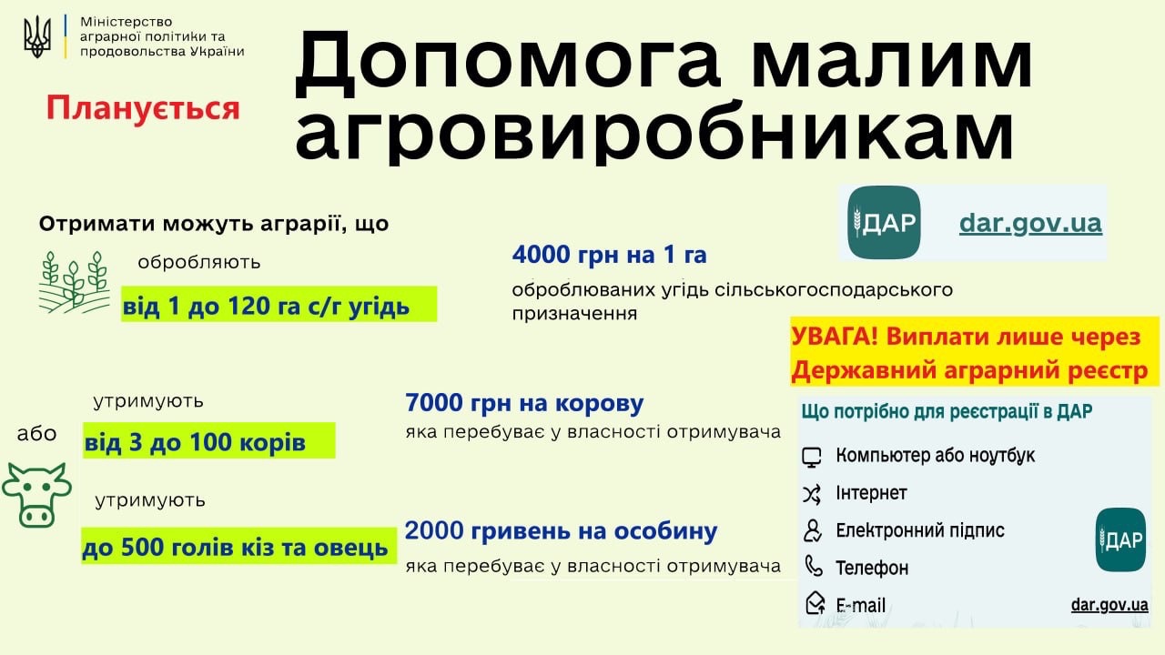 Для аграріїв, які утримують від 3 до 100 корів, передбачаються виплати у розмірі 7 тисяч гривень на одну голову; за вирощування до 500 голів кіз та овець – 2 тисячі гривень на одну особину. Крім того, аграрії, які обробляють від 1 до 120 га земель сільськогосподарського призначення, зможуть отримати за один гектар 4 тисячі гривень безповоротної допомоги.
