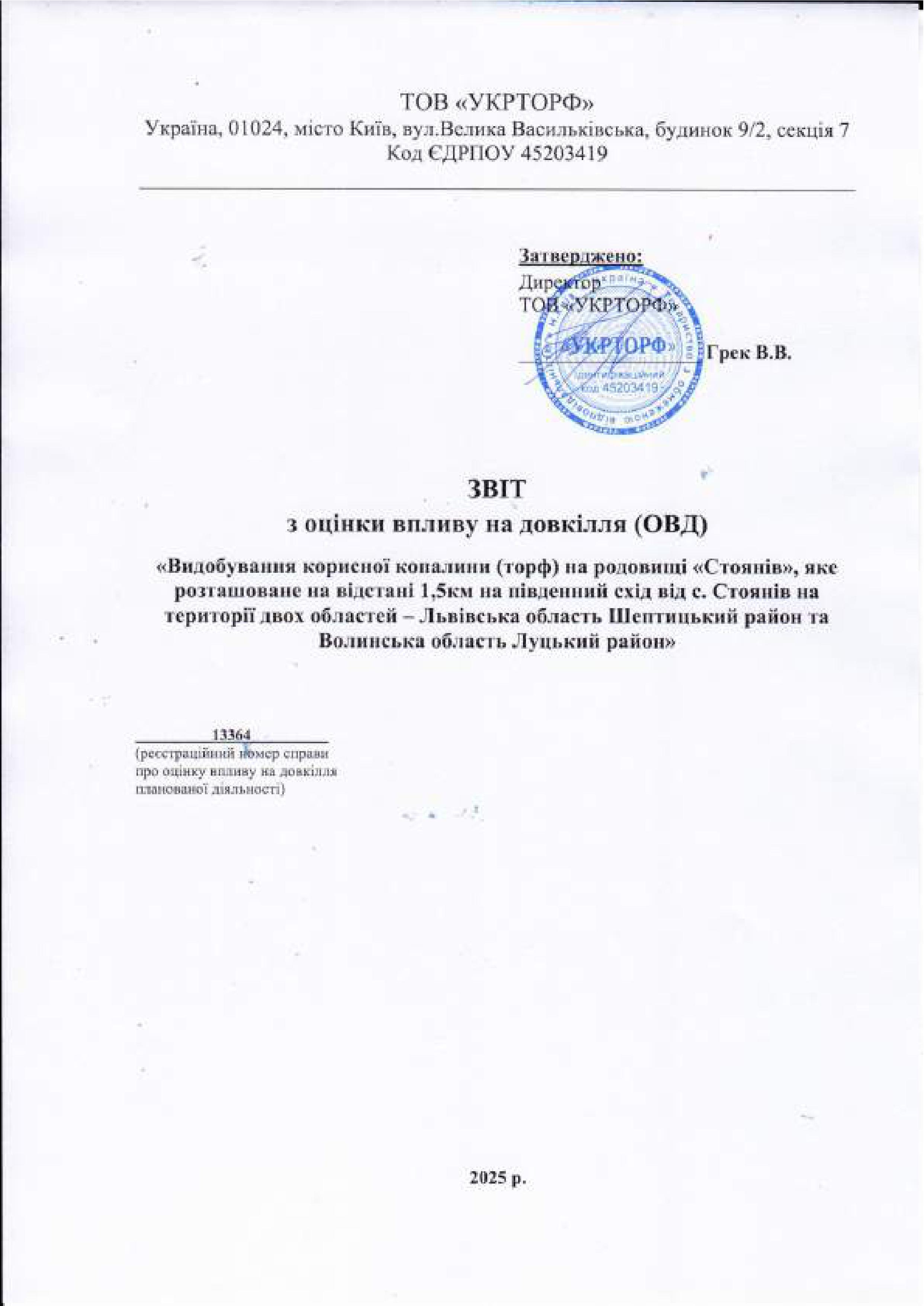 Звіт з оцінки впливу на довкілля планованої діяльності: «Видобування корисної копалини (торф) на родовищі «Стоянів»