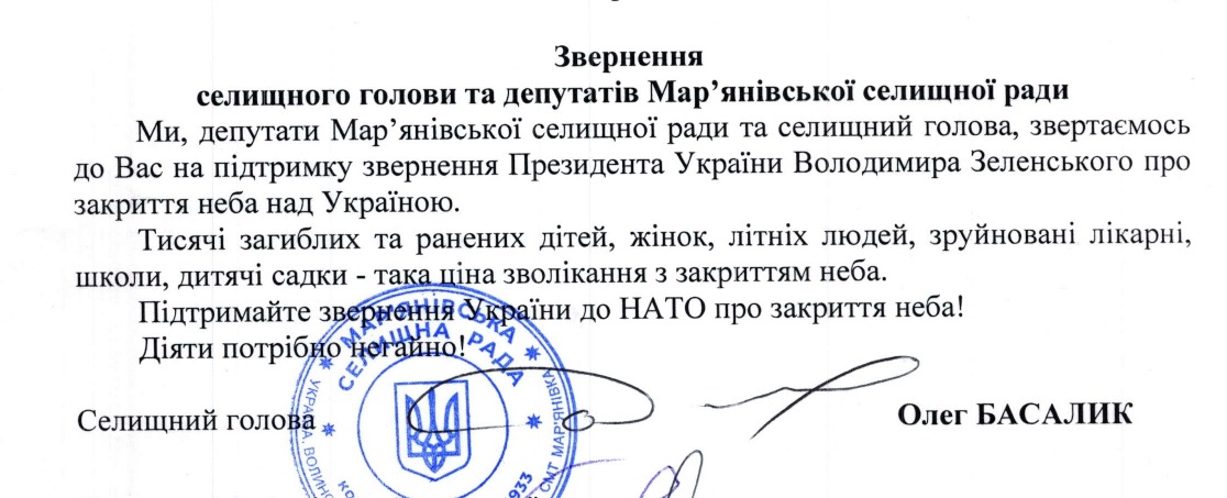 Звернення Мар'янівського селищного голови та депутатів Мар'янівської селищної ради