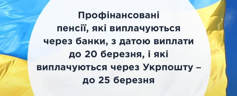 Профінансовані пенсії, які виплачуються через банки, з датою виплати до 20 березня, і які виплачуються через Укрпошту - до 25 березня