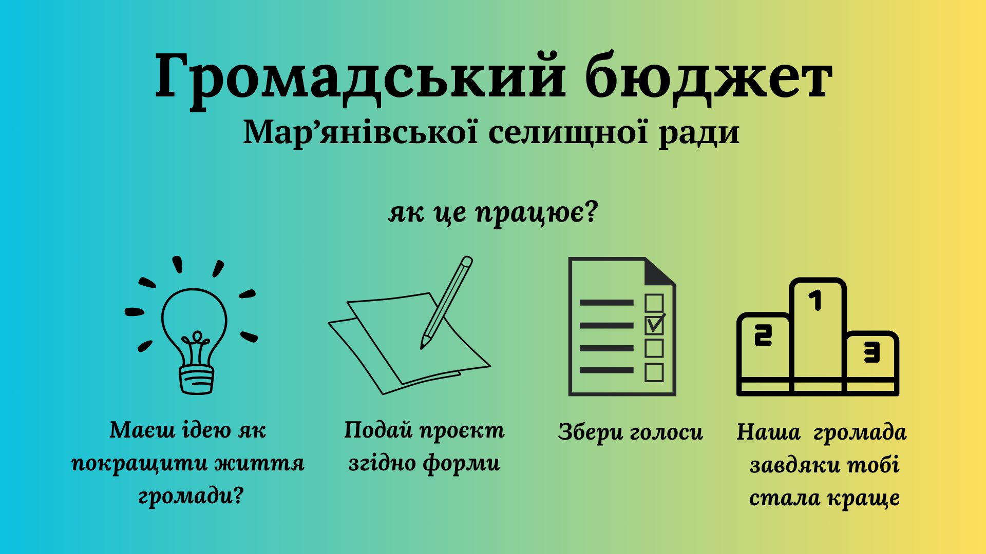 Громадський бюджет Мар’янівської селищної територіальної громади - це процес взаємодії селищної ради та її виконавчих органів з громадськістю, направлений на залучення жителів громади до участі у бюджетному процесі шляхом прийняття рішень щодо розподілу визначеної селищною радою частини місцевого бюджету через подання відповідних ініціативних проєктів розвитку, спрямованих на вирішення пріоритетних проблем населених пунктів Мар’янівської селищної територіальної громади та його жителів, проведення відкритого громадського голосування за такі проєкти.